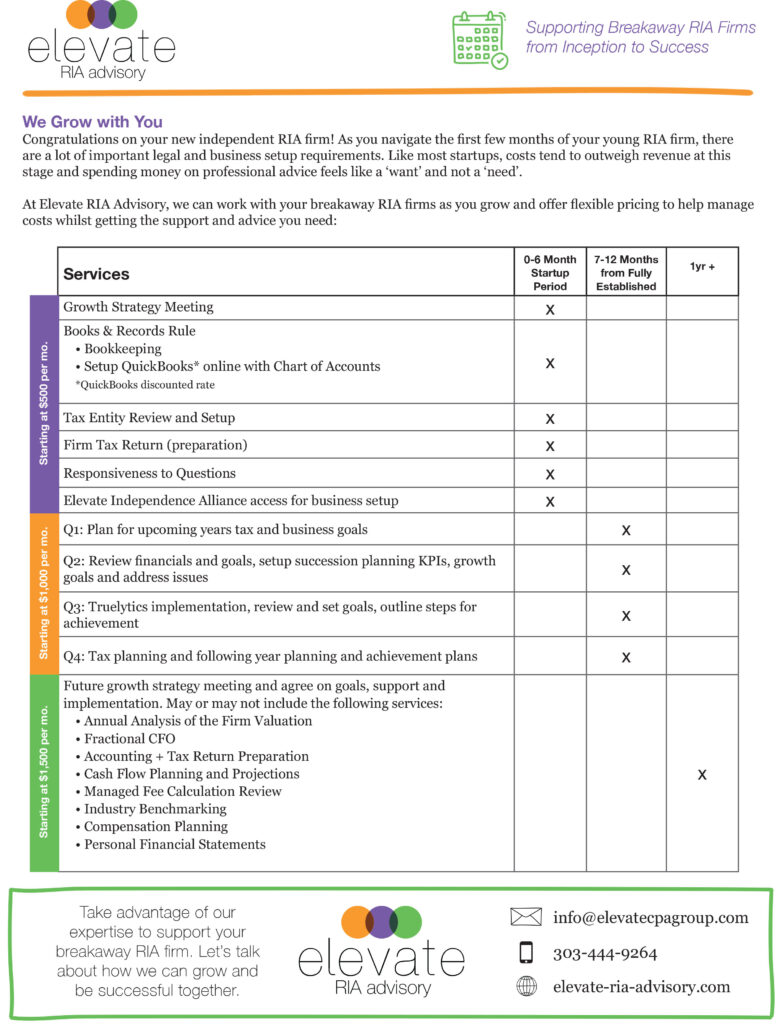 We know the financial services industry. Elevate RIA Advisory only works with financial professionals (financial advisors, certified financial planners, wealth managers, etc.) and have lots of experience helping to setup successful independent RIA firms. We help them to setup their company, books and records, tax and accounting and much, much more. Plus, we created and lead the Elevate Independence Alliance. This is a group of professionals that, like us, are dedicated to the financial services industry and includes all of the professional experts you need to become an independent RIA firm. The Elevate Independence Alliance helps you setup a successful independent RIA and makes the transition process smooth sailing!