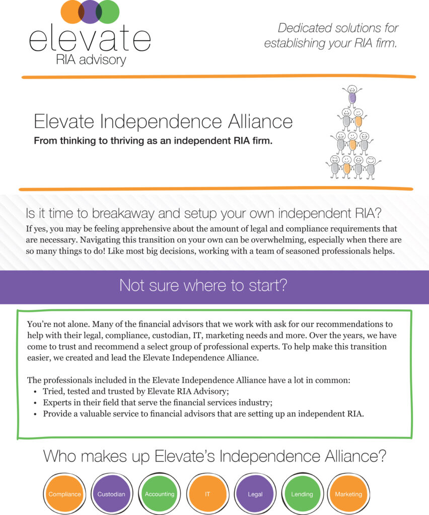 Not sure where to start? You’re not alone. Many of the financial advisors that we work with ask for our recommendations to help with their legal, compliance, custodian, IT, marketing needs and more. Over the years, we have come to trust and recommend a select group of professional experts. To help make this transition easier, we created and lead the Elevate Independence Alliance.